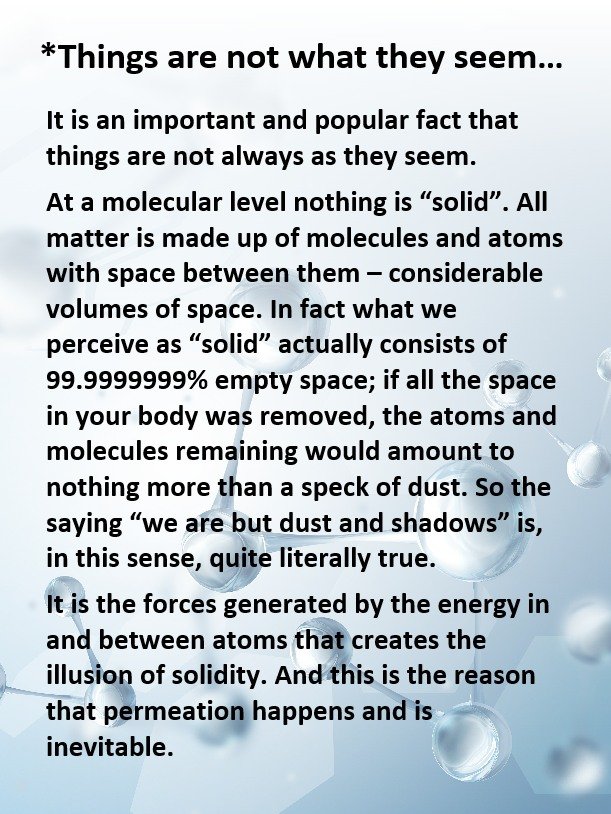 Whilst PENETRATION is a MACRO level process where a chemical physically passes through holes or gaps in the structure of a non-barrier fabric, PERMEATION is a process occurring at a MICRO level whereby the molecules of the chemical pass between the molecules of the material itself. No holes or gaps in the structure of the barrier are required. Permeation will occur through a “solid” barrier*. The key differences and consequences are shown in the table below:-