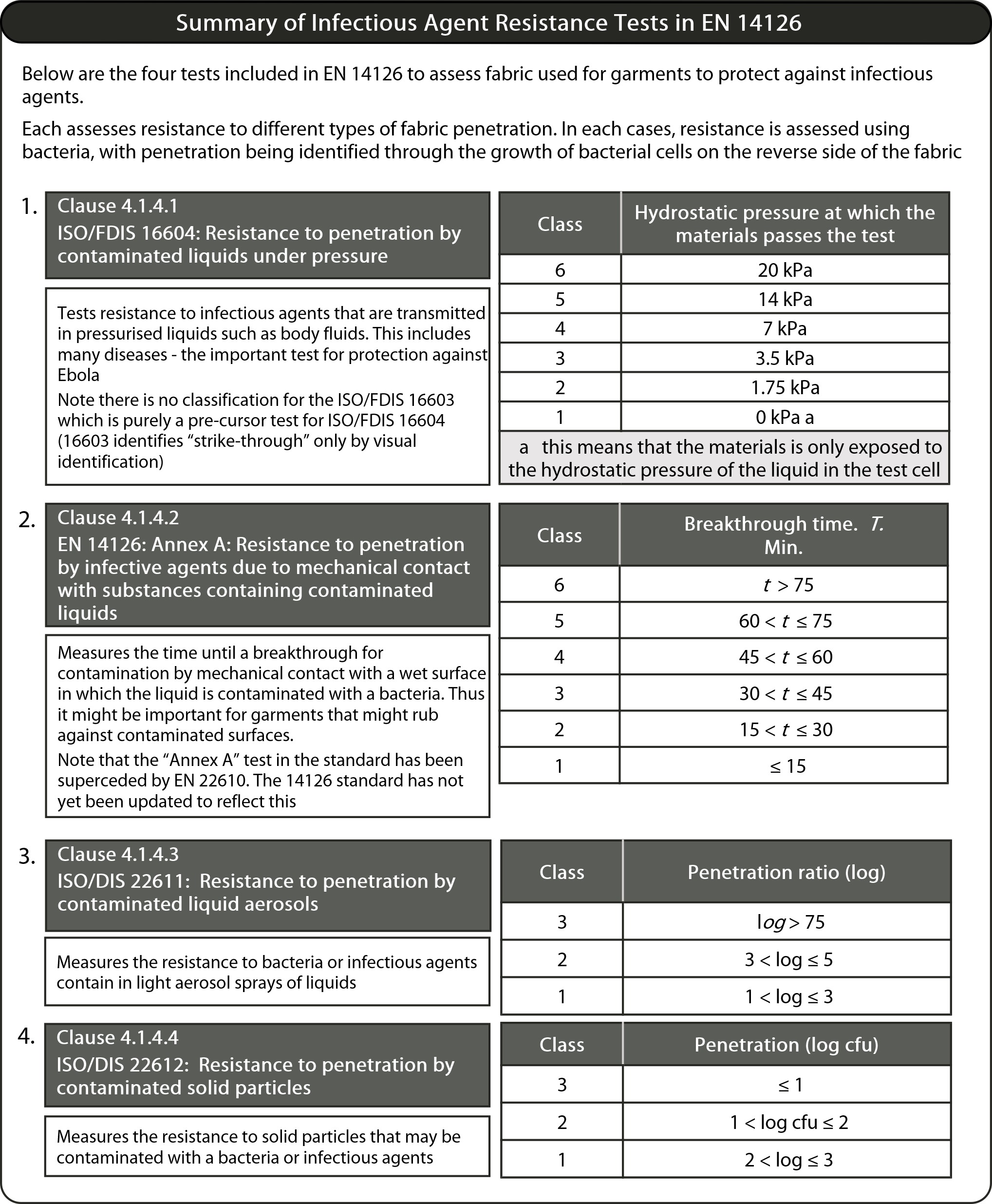 The EN 14126 standard contains only FOUR tests – not five as some manufacturers suggest. A common claim by some producers and suppliers is that their garment is suitable because it achieves a classification in ISO 16603. This is incorrect; there is no classification in the standard for ISO 16603 test results and ISO 16603 is an inferior test to 16604: it is not intended to indicate any level of protection.