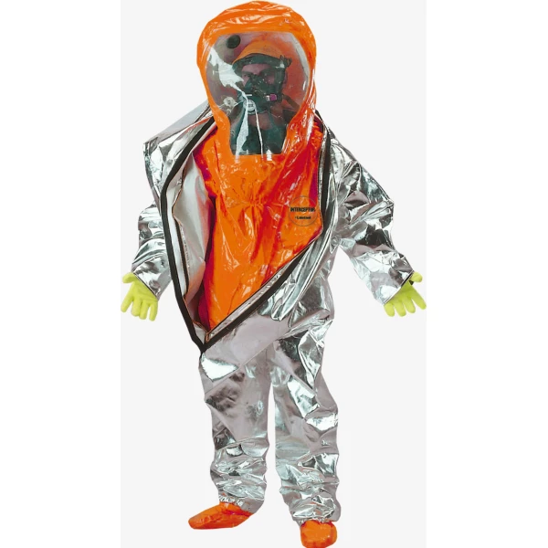 1.Outer layer is aluminized fiberglass which can protect against above 95% heat emission; inner layer is level A gas-tight chemical protective coverall. 2.Fully encapsulated front entry gas protective suit(Level A),expand back. 3.Sealed seam plus inside and out,48‘‘zipper,double storm flap with hook and loop closure. 4. 2-layers face shield, 3 layers glove system, 3 exhaust valves, attached sock boots with boot flaps.