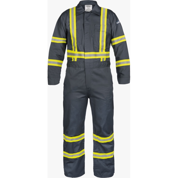 For protection against flame. 9oz. 100% FR Cotton Coverall with Reflective Trim for Added Visibility.