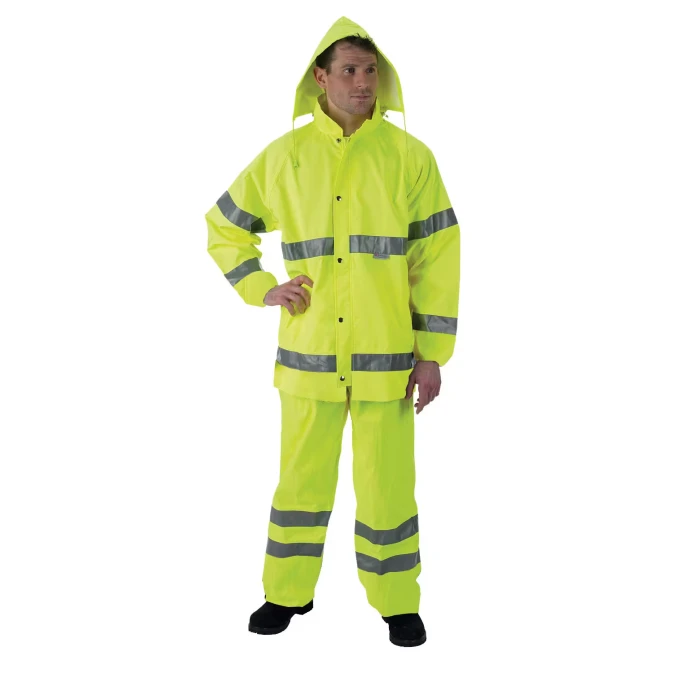 Class III PVC, Coated Polyester Set, ANSI 107-1999 class 3, Water proof and wind proof, Two lower slash pockets, Two pass through slash pockets on pants, Adjustable pant legs, Back ventilation