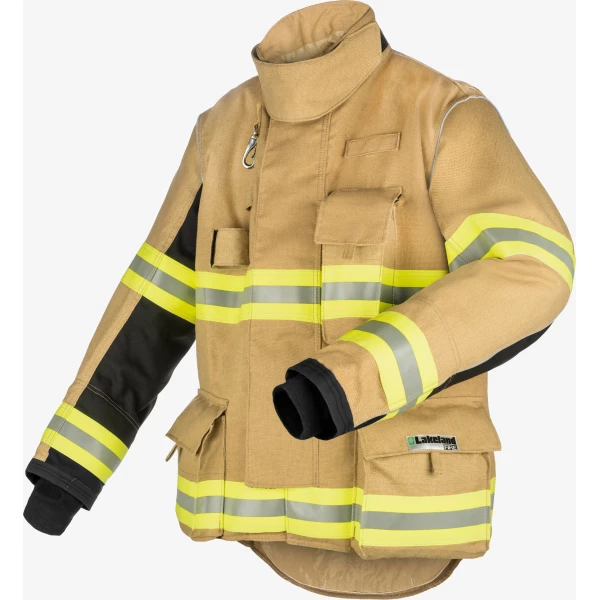 Stealth premium turnout gear coat, NFPA 1971-2018; Material combination: Kombat flex outer shell, Stedair 3000 moisture barrier, Defender M SL2 thermal liner; Kombat flex outer shell: 6.9oz. per square yard, durable fabric, high thermal stability; Stedair 3000: 5.2 oz. per square yard spun Nomex laminated to an PTFE membrane, a combination of microporous and monolithic barriers; Defender M SL2 thermal liner: 7.8 oz/yd2 two layers flat Kevlar and Nomex spun lace quilted to a Lenzing FR / Kevlar / Nylon plain weave facecloths.